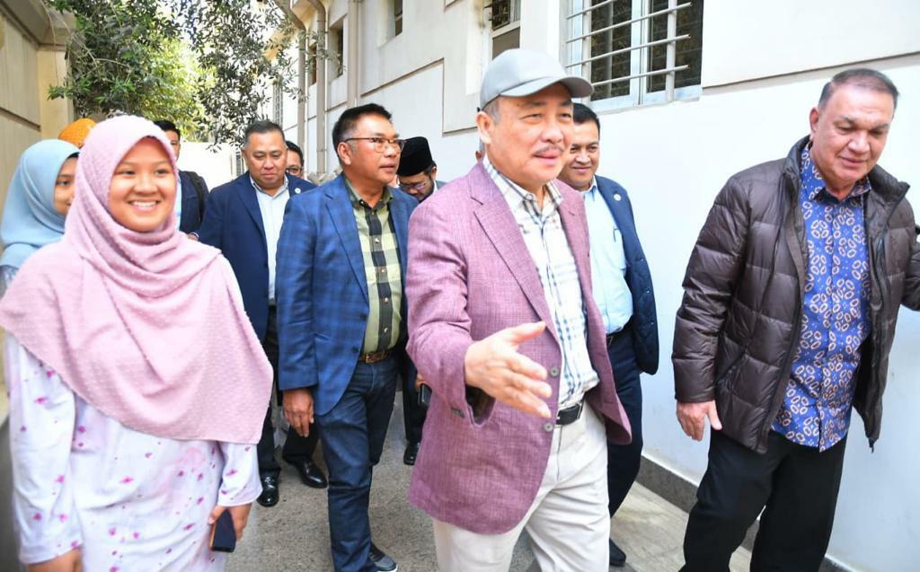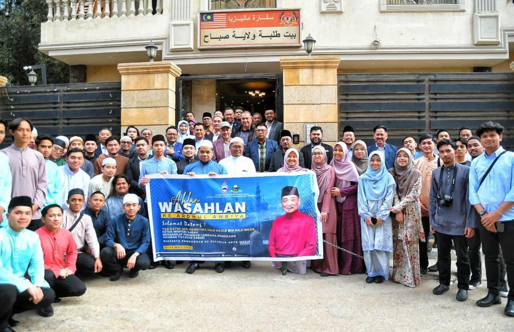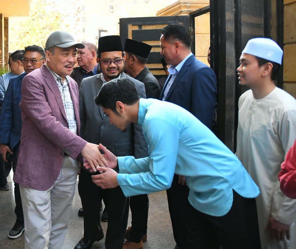 YAB Datuk Seri Panglima Haji Hajiji Bin Hj Noor, Ketua Menteri Sabah bersama YB Datuk Dr Hj Arifin bin Hj Arif ,Menteri Sains Teknologi Dan Inovasi diiringi YB Datuk Seri Panglima Sr. Haji Safar bin Untong,Setiausaha Kerajaan Negeri dan YBhg. Datuk Zainudin Bin Aman, Setiausaha Tetap, Kementerian Sains Teknologi dan Inovasi serta Ketua Jabatan daripada Agensi Agama beramah mesra dengan sebahagian pelajar Mesir semasa tinjauan ke asrama Yayasan Sabah di Kaherah pada 18 Mac 2023.