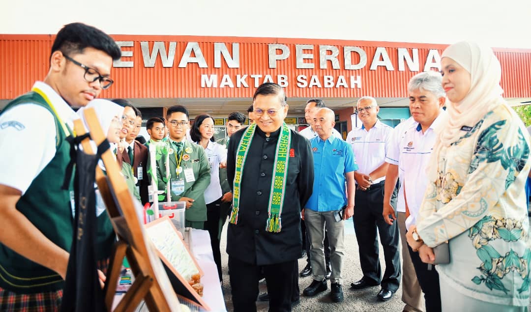 YB Datuk Dr Haji Arifin bin Datuk Haji Arif (JP), Menteri Sains, Teknologi dan Inovasi Sabah diringi Musleha Khairunisa Binti Muluk, Ketua Penolong Setiausaha Kanan KSTI hadir pada Majlis Penutupan Karnival STEM Peringkat Sekolah Menegah di Maktab Sabah.