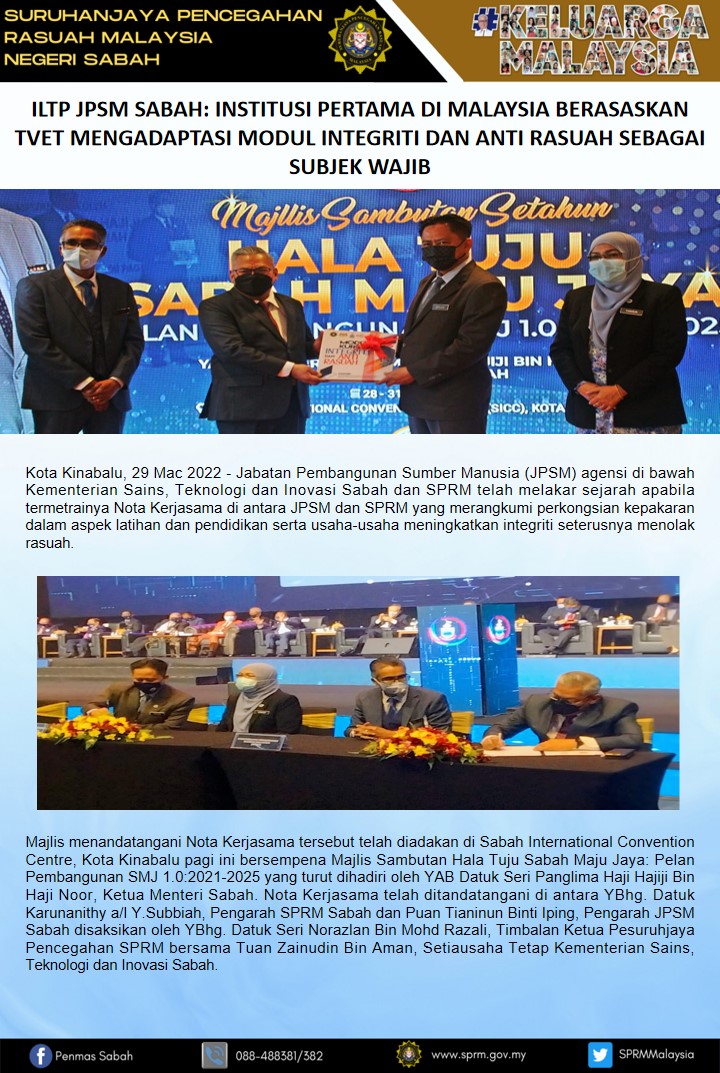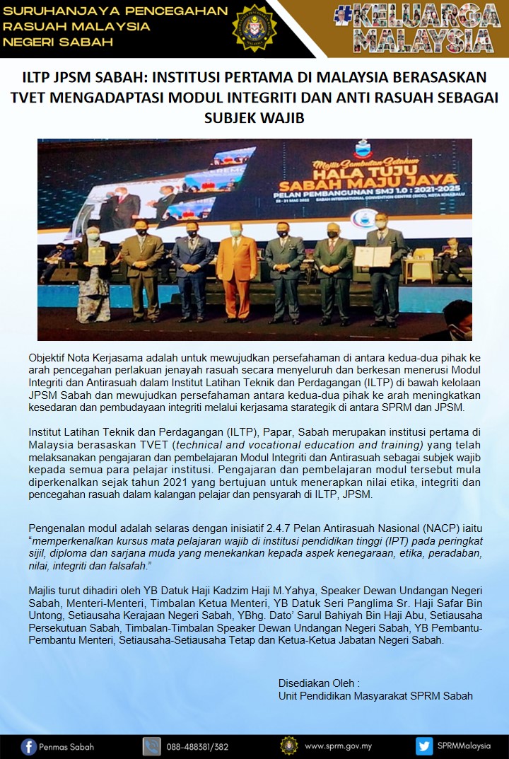 SPRM : ILTP JPSM SABAH: INSTITUSI PERTAMA DI MALAYSIA BERASASKAN TVET MENGADAPTASI MODUL INTEGRITI DAN ANTI RASUAH SEBAGAI SUBJEK WAJIB